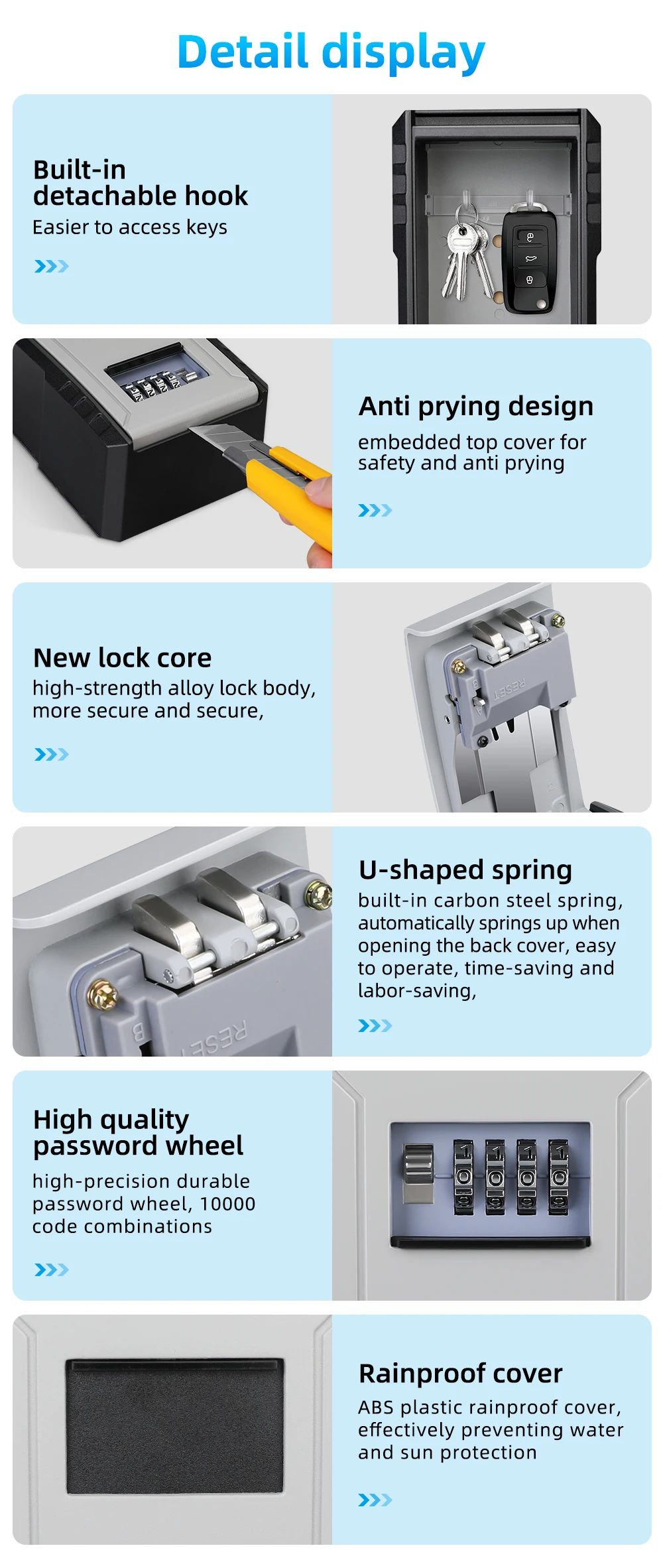 1. Durable material: This key lock box is made of Zinc Alloy, which can protect the box from hammering, sawing or prying.